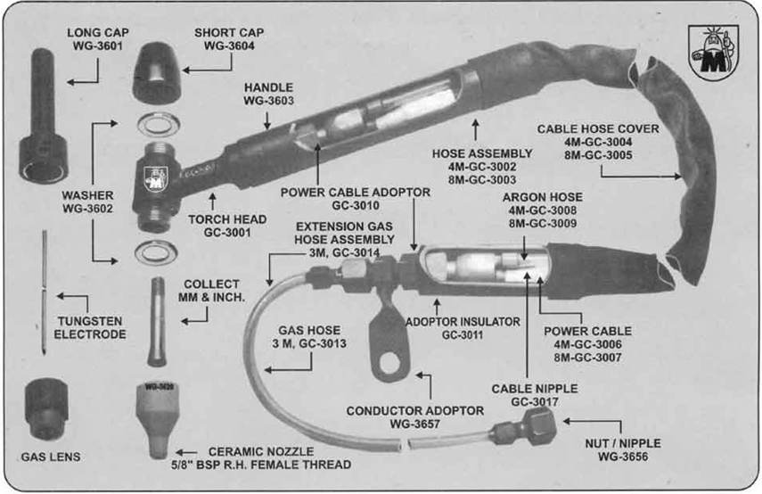 The Model MSC GAS COOLED 300 medium weight REVERSIBLE ANGLE HEAD TORCH. Two separate lines for Gas and Current allows continuous work without over heating. It is designed for Current rating 300 Amperes DC or 240 Amperes AC. Standard Accessories Kit, Handle, Washer, Conductor Adoptor are interchangeable with Model MSC WATER COOLED 600 Amps. The Torch is recommended for the Tungsten Electrodes upto 4mm (5/32") Diameter.