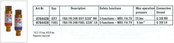 The FR34 flashback arrestors are basic models of 3-function FBA designed to be mounted on the regulator side. Flow capacity of FR34 is sufficient for a whole range of manula cutting or welding applications and even for basic machine cutting up to 200mm. these arrestors fully comply with EN730 and ISO5175. FR34 offers three safety functions.