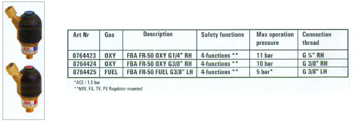 A regulator mounted safety device suitable for all welding and cutting operations, fully complying with EN730, this lift to rest" unit incorporates the following features. FA Sintered flame arresting element.